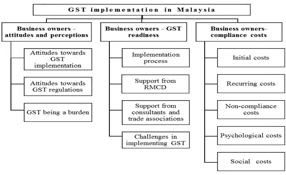 The participants’ lived experiences with GST implementation are classified into three main themes – business owners’ attitudes and perceptions, GST readiness and compliance costs – and 12 sub-themes. The sub-themes provide a richer understanding of the GST implementation experience among taxpayers, as illustrated in Figure 3.