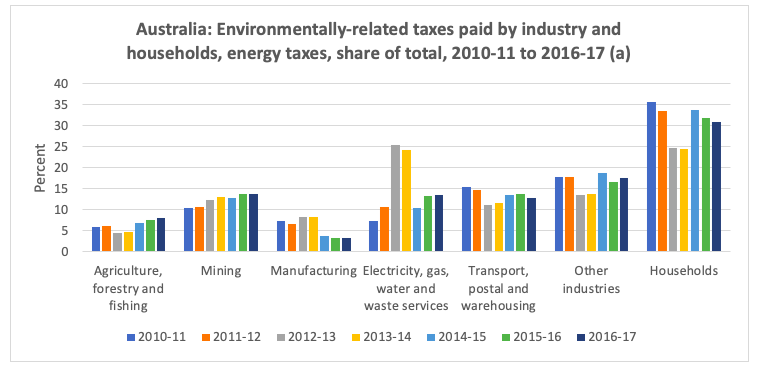 Own construction. Source: Australian Bureau of Statistics, Australian Environmental-Economic Accounts 2019. (a) Includes Excise on Crude oil and LPG, Carbon pricing mechanism, Renewable energy certificates, Energy Savings Scheme, Greenhouse Gas Reduction Scheme, The Queensland Gas Scheme, The Retailer Energy Efficiency Scheme and Victorian Energy Efficiency Target scheme.