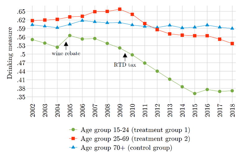 Our study separates the tax effect from the general downward trend. On a technical side, we implement a difference-in-difference strategy and verify the common trend assumption by estimating a distributed lag difference-in-difference specification and testing that the coefficients prior to the tax are jointly statistically indistinguishable from zero. We also complement our difference-in-difference specification with the comparative interrupted series analysis, which allows for flexible pretreatment trends. Therefore, we are able to show the RTD tax reduced alcohol consumption among those aged 25-69 but had no effect on on those under 25.