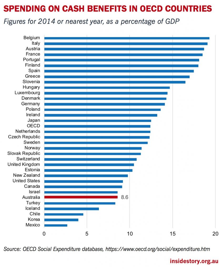 Tax revenues in Australia are about six percentage points of GDP below the OECD average, and our total level of spending is eight percentage points of GDP below the average, with our social security spending being four percentage points of GDP below average. In this sense, our low social security spending accounts for nearly half of our overall lower spending and consequently our lower taxes.