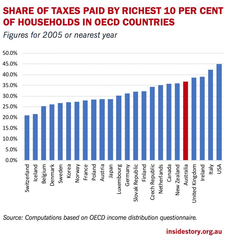 I want to argue that the share of tax paid by the highest earners needs to be judged in relation to the share of total income they receive — not simply their proportion of the population. The more unequal a society, the more the rich should be expected to pay in taxes. Compared to other high-income countries in the OECD, Australia’s income tax system is very progressive, yet the overall level of taxes paid by Australians — including high earners — is lower than in most.