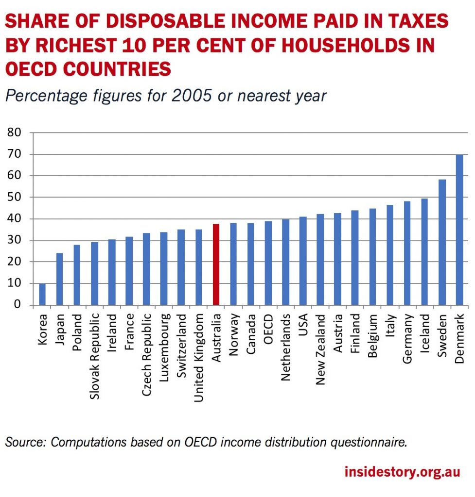 The chart below shows that the richest 10 per cent of households in Australia paid 37.8 per cent of their disposable income in taxes, just below the OECD average of 38.8 per cent, a little higher than in Britain but lower than in Canada, the United States or New Zealand — and very much lower than in Denmark, Sweden and Iceland.