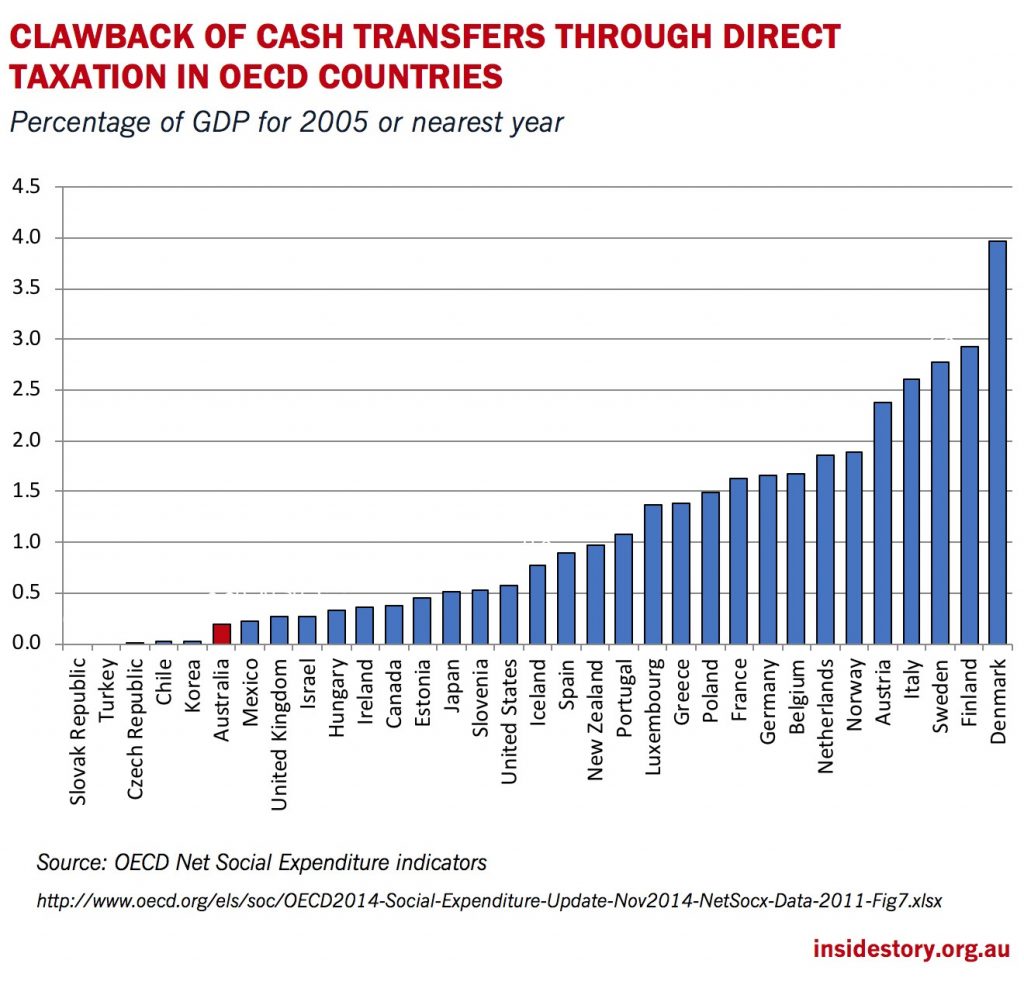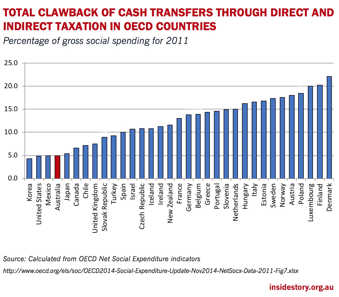 The fact that Australia overall has the most income-tested social security system of all OECD countries is linked to the fact that we tax cash benefits less than most. Income-testing is a way of taxing in advance rather than clawing back spending through the tax system after payments have been made. Each can be regarded as differing ways of seeking to achieve rather similar goals.