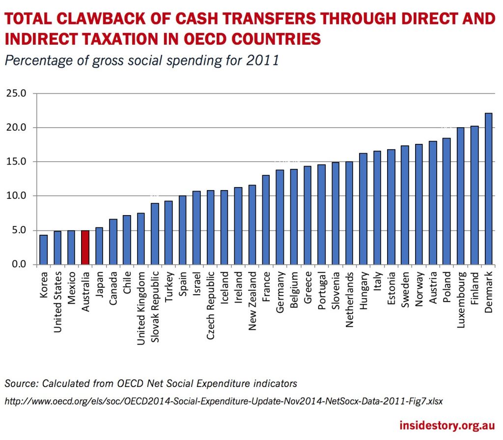 The final of these charts shows the combined effects of direct and indirect taxation on the level of social spending, expressed as a percentage of gross social spending. Australia had the equal third-lowest level of tax clawback in the OECD in 2011, at 4.9 per cent of social spending. At the other extreme, in Luxembourg, Finland and Denmark, 20 per cent of a much higher level of spending is clawed back.