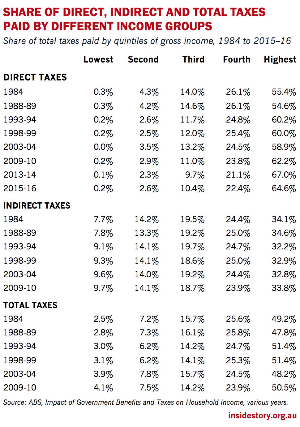 It’s a familiar theme. Back in 2013, the Financial Review’s Fleur Anderson was suggesting that “the middle class and the professions are staging a revolt as they find their growing share of the tax burden too hard to bear, after over a million people were made exempt from the tax system over the past ten years.” In that newspaper and elsewhere, commentators pointed to the Australian Tax Office’s tax statistics for the 2010–11 financial year, which showed that the top 5 per cent of income earners paid 34.1 per cent of net income tax and the top 25 per cent paid just over two-thirds. (The share paid by the top 5 per cent had fallen to 33.0 per cent by 2015–16.)
