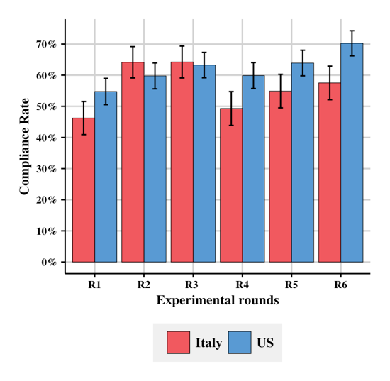 As can be seen in Figure 1, Italians do not seem to be less willing to pay taxes when the institutions/incentives are the same. Indeed, when their money is put in a pot and shared equally among everyone in the room in round two, Italians increase their compliance significantly more than Americans. This implies that Italians are significantly more responsive to redistribution than Americans.