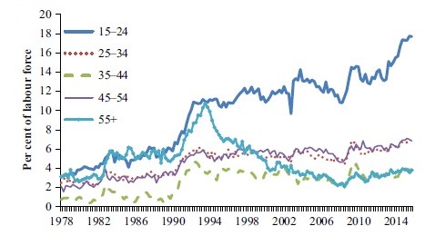 The striking trend since the early 1990s is the divergent experiences of young, middle-aged and older people. It is clear that young people have borne the brunt of growth in un- and under-employment since then. However, if mature age workers lose their old ‘steady job’, they seem to face a labour market just as hostile as that confronting young people.