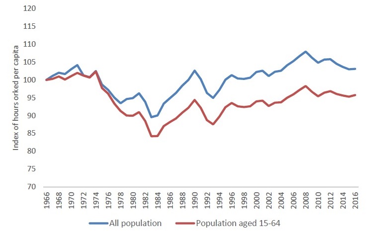 Since much growth in employment has been part-time, the volume of working hours per capita is a better summary of the state of employment than the share of people employed.
