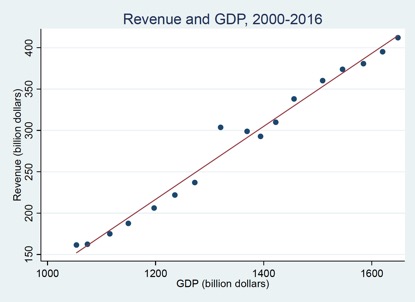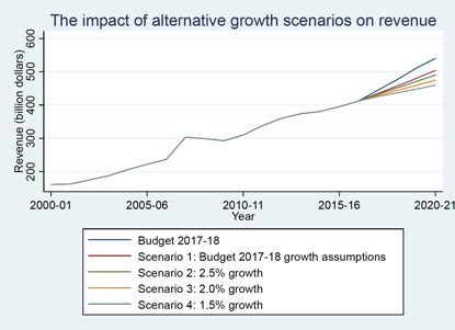 The relationship is linear, which means that GDP forecasts for the coming years can be used to predict future government revenues. These predictions will be fairly accurate as long as the GDP forecasts are correct. Unfortunately, the assumptions about GDP growth in the Budget 2017-18 are quite optimistic (2.75% in 2017-18 and 3% afterwards). Budget calculations should be based on conservative growth assumptions to account for some of the fiscal uncertainty associated with predicting future outcomes.[1] It is useful to consider alternative growth scenarios to understand the implications of economic growth assumptions for government revenue.
