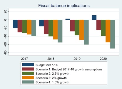 Assuming a growth rate of 2.5% over the next four years (which is still quite optimistic) increases the fiscal deficit to about $38.9 billion in 2020-21 (Scenario 2, the green bars). Assuming 2% growth is associated with a deficit of about $54.4 billion in 2020-21 (Scenario 3, orange), and a growth rate of 1.5% increases the deficit to $69.8 billion in 2020-21 (Scenario 4, grey). Taken together, these results indicate that the fiscal deficit is likely to remain substantial in the absence of a serious tax reform.