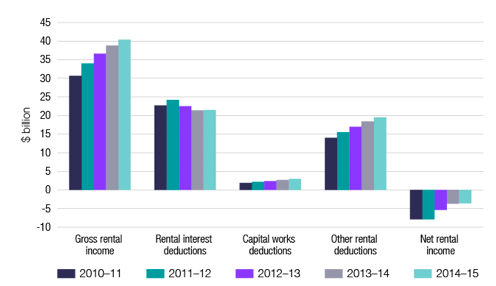 Net rental losses have almost halved in the last few years, mostly as interest rates declined, but were still $3.5 billion in 2014-15. ATO statistics reveal that the biggest contributor to negative gearing remains interest expense; it was recently identified that half of Westpac’s loan book is interest-only loans.