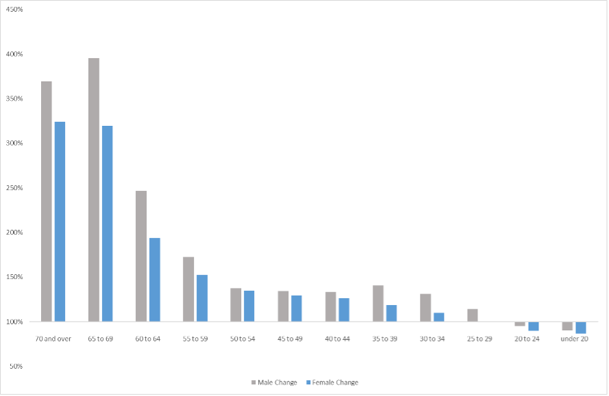 Critically, for women, most age groups are worse off. Although we observe males experienced a jump in wages between 35-39, which is reversed between 40-54, before substantially growing thereafter.