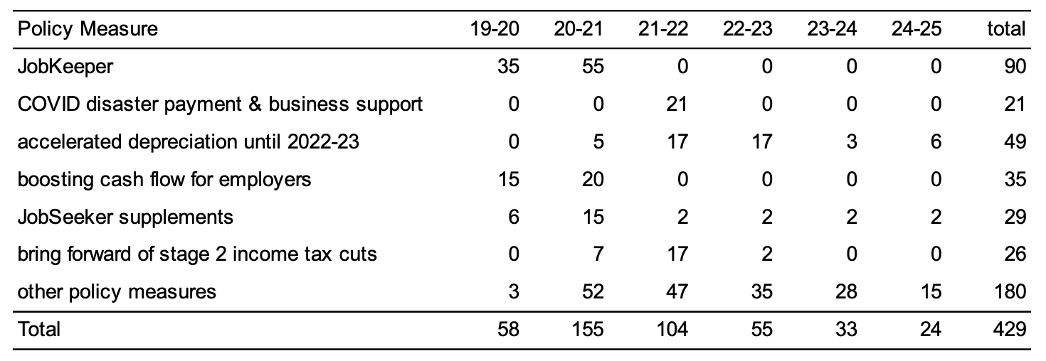 The COVID-era fiscal policy measures announced in 2020 and 2021 did more than compensate for these income losses, they over-compensated. These measures had a massive total budget cost of $429 billion, as seen in Table 1. This is the equivalent of 20.8 per cent of last year’s GDP. Of this total amount, the 2021-22 MYEFO identifies $337 billion as being specifically related to COVID, there being $92 billion in non-COVID measures.