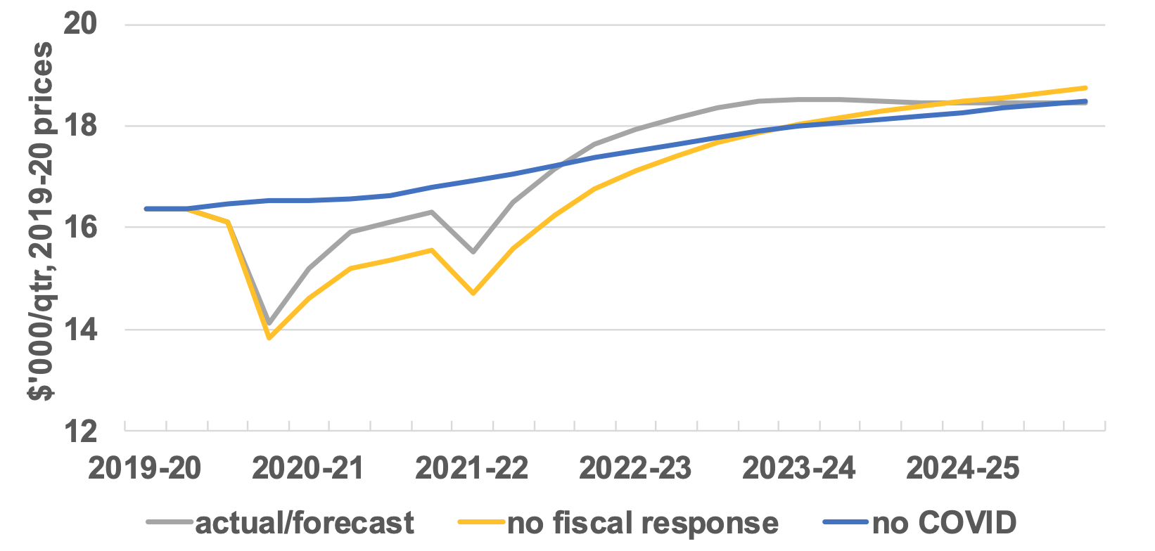 COVID suppressed some areas of household consumption (Figure 1). With no fiscal response, consumption would have been 9 per cent lower in 2020-21 (yellow line) than with no COVID (blue line). The actual fiscal response limited the loss in consumption in 2020-21 to 5 per cent, but the lifting of restrictions results in consumption surging to be 3 per cent higher in 2022-23 (grey line) than with no COVID. This surge is unsustainable.