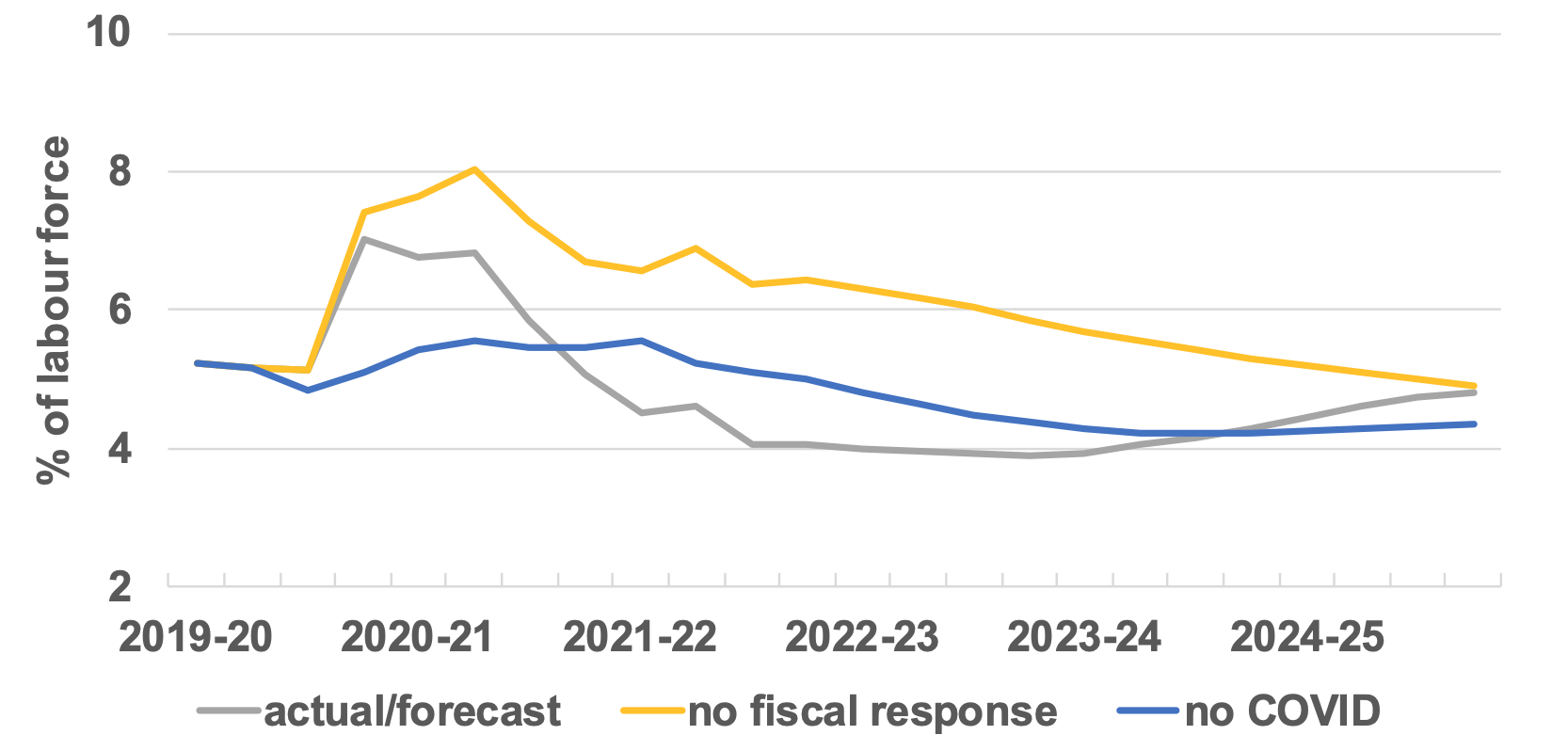 These COVID effects on consumption are the main driver of the COVID effects on unemployment (Figure 2). With no COVID, unemployment would have stabilised near 4.3 per cent from 2022-23 onwards (blue line). Under COVID, with no fiscal response, unemployment would have reached a peak of 8 per cent (yellow line), and then would have only gradually subsided. The actual fiscal response limited the rise in unemployment, but unemployment is unsustainably low at 4 per cent through 2022 and 2023 (grey line).