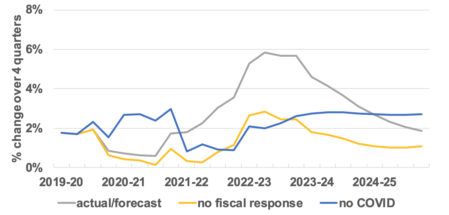 These developments in consumer demand and unemployment drive the COVID effects on inflation (Figure 3). With no COVID, inflation would have been close to 2.7 per cent from 2022-23 (blue line), achieving the Reserve Bank’s 2 to 3 per cent target. Under COVID, with no fiscal response, weak consumer demand and high unemployment would have pushed inflation well below this target, with inflation still as low as 1 per cent in 2024-25 (yellow line). However, the actual fiscal response led to unsustainably high consumer demand and, to a lesser extent, unsustainably low unemployment, and is forecast to drive inflation up to near 6 per cent in the year to the June quarter 2023 (Figure 3, grey line), as noted at the outset.