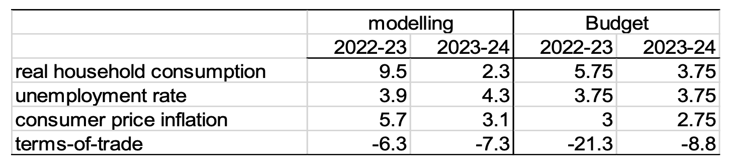 Table 2 compares the inflation forecasts and their main drivers between the Budget and the modelling here. In the Budget, the recovery in real household consumption is less pronounced and more drawn out. As a result, real consumption grows by 5.75 per cent rather than by 9.5 per cent in 2022-23. This less rapid growth in consumer demand results in the lower inflation forecast of 3.0 per cent compared to 5.7 per cent.