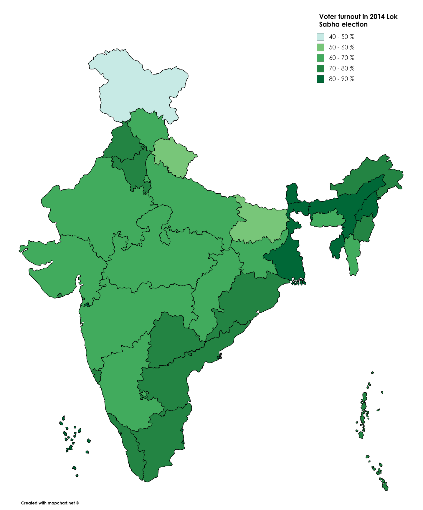 Figure 1 – Voter turnout in 2014 Lok Sabha election (Figure by the authors based on data from the Election Commission of India)