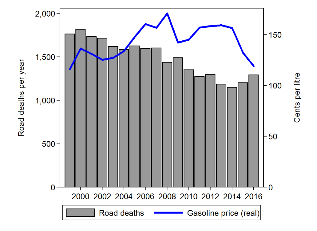 Using data for the period 1989–2017, we estimate that each 1% reduction in petrol prices typically leads to around 0.2% more road deaths in the short run, holding other factors constant. This implies that the decline in fuel prices in 2015 and 2016 made a sizeable contribution to the increase in Australia’s road death toll.