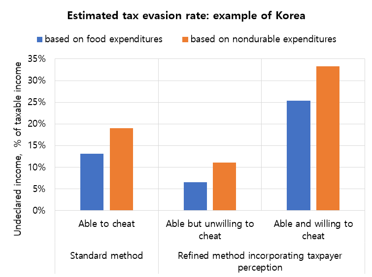 The below figure shows the estimation results, based on two different measures of expenditures – the food Engel curve, as widely used in the literature, and the nondurables Engel curve, to account for demand heterogeneity among households. In case of the food Engel curve, the standard method yields a uniform tax evasion rate of 13 percent, but the refined method provides a range of 7 to 25 percent based on taxpayer perception. Estimation based on the nondurables Engel curve shows a similar trend, albeit at generally higher rates of tax evasion.