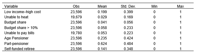 Objective measures of energy poverty may provide a more accurate measure of energy poverty (unless low-income retirees have the means to limit energy expenditure). However, subjective measures of energy poverty capture the ‘feeling’ of energy poverty. Since these two measures may not coincide, we explore both objective and subjective measures of energy poverty.