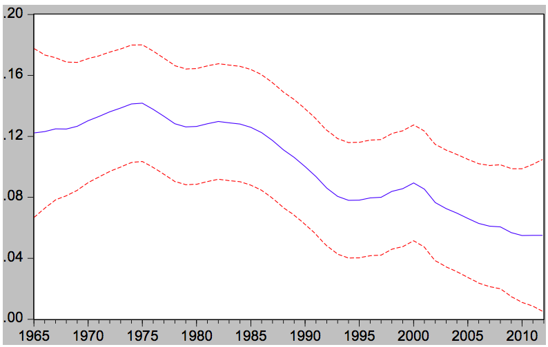 We sourced the ATO’s annual costs between financial years 1964 and 2012 for our analysis. The estimated growth rates of the complexity of the tax system are presented in Figure 1. The blue line represents point estimates of the growth rates of the tax system complexity and the red lines are 95% confidence interval.