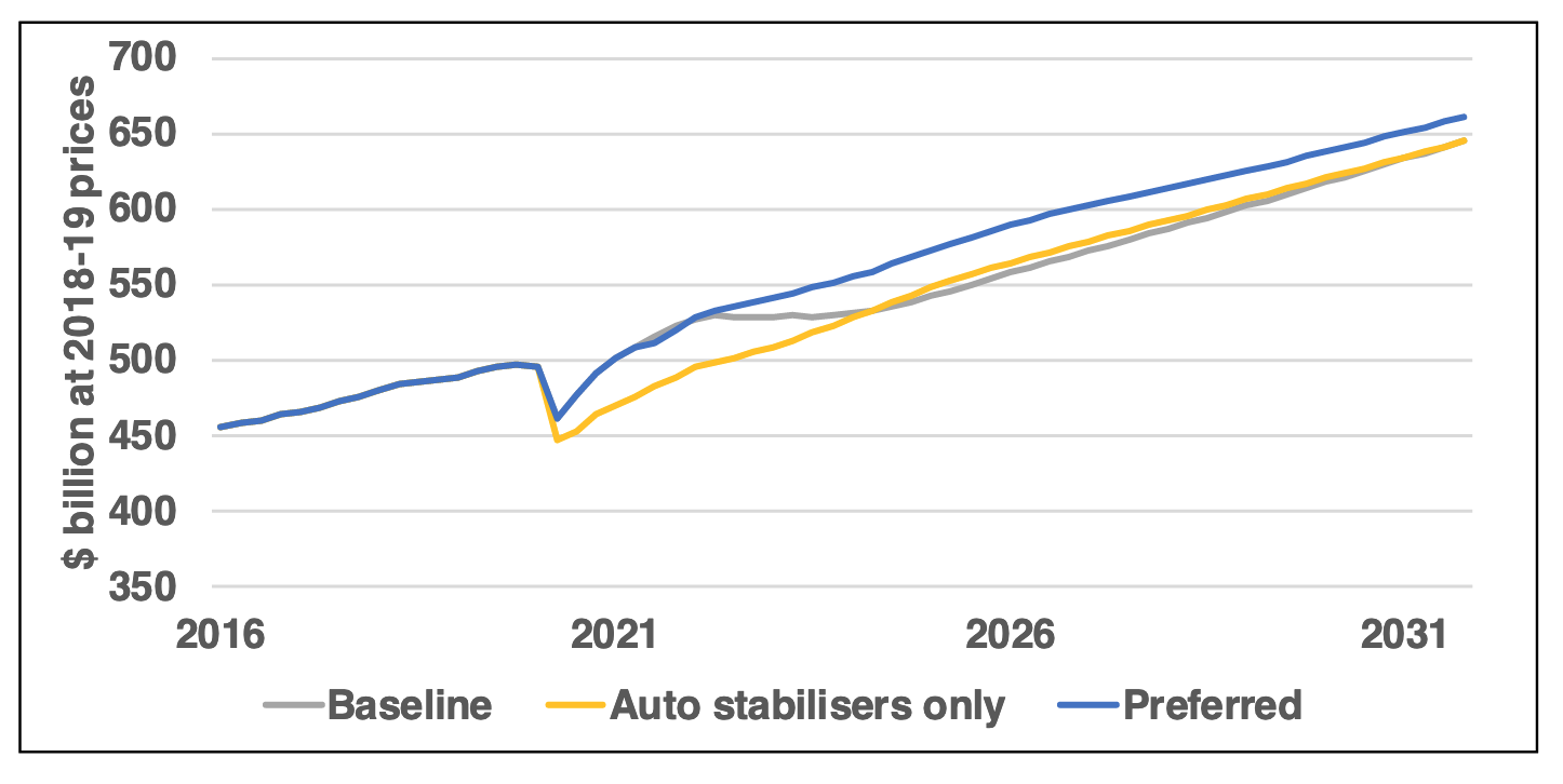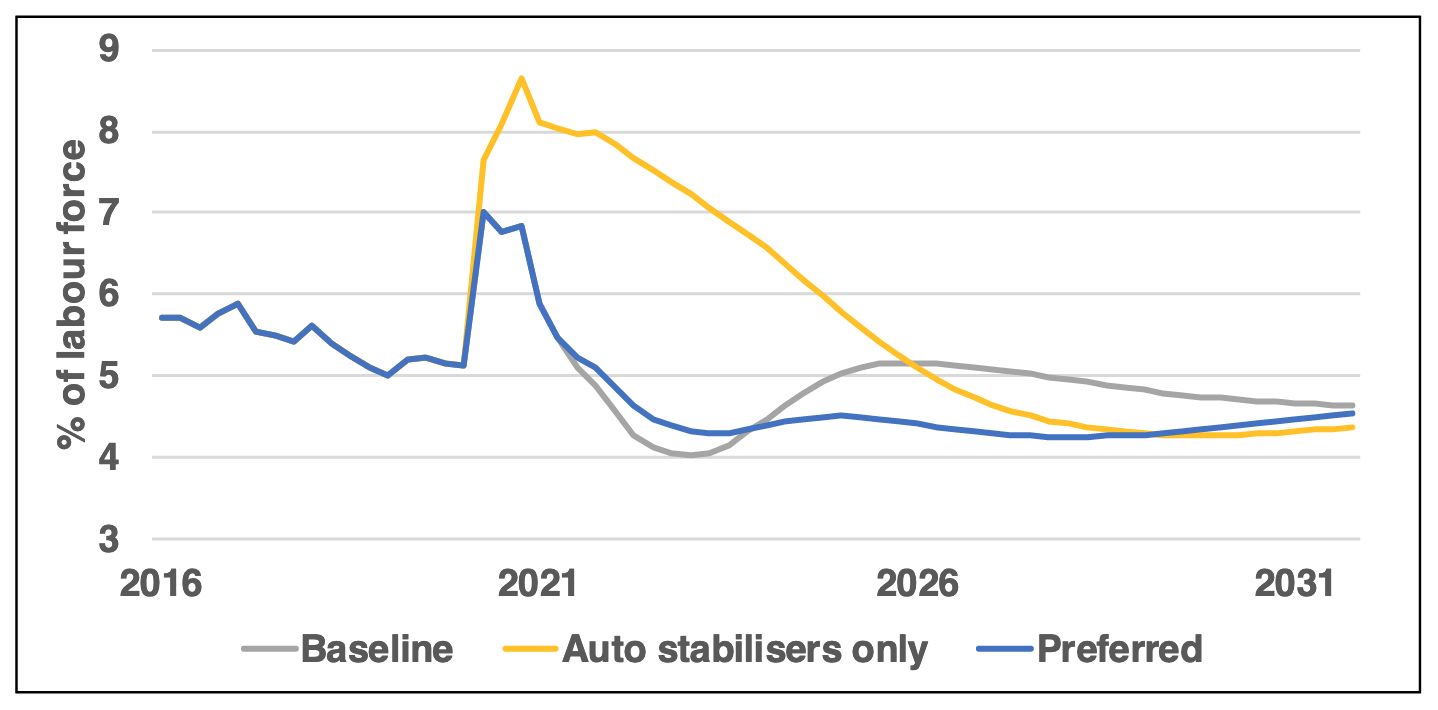 However, even better outcomes are achieved in the Preferred Scenario. This scenario largely ends the fiscal stimulus from 2021-22 following the end of most economic restrictions (other than on international travel), reducing it from $373 billion to $257 billion. In the Baseline Scenario, over-stimulation of the economy leads to inflation, higher interest rates and swings in unemployment from 2022 to 2024 (see Chart 2). In the Preferred Scenario, unemployment stabilises more quickly near a sustainable rate of 4.5 per cent (see Chart 2).