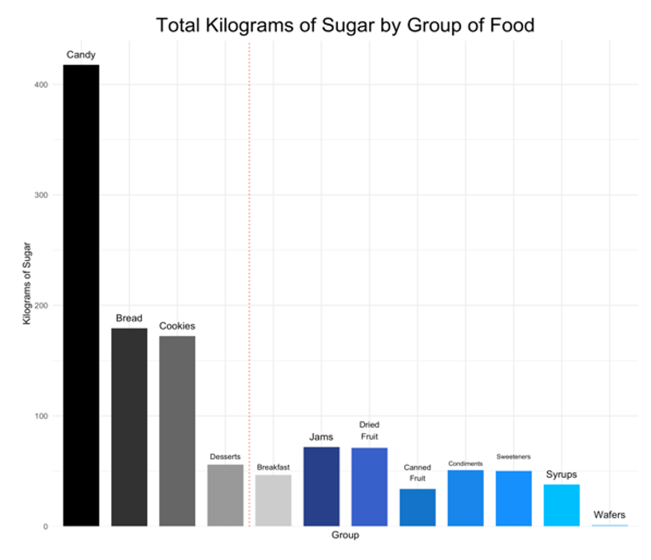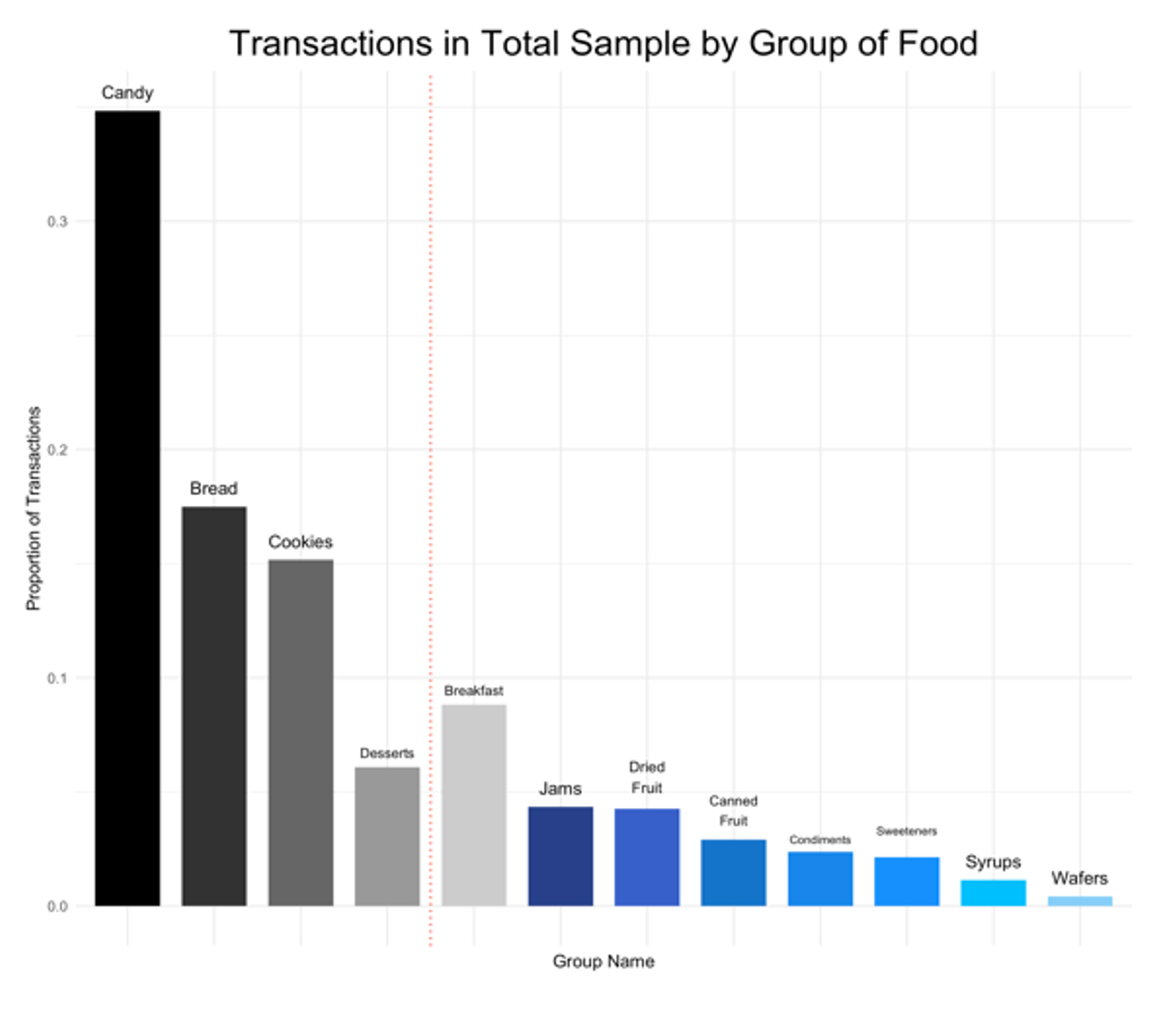 Note: The red line distinguishes the main 4 groups (Candy, Breads, Cookies and Desserts), their contribution in sugar and number of transactions accounts for more than 80% of the total.