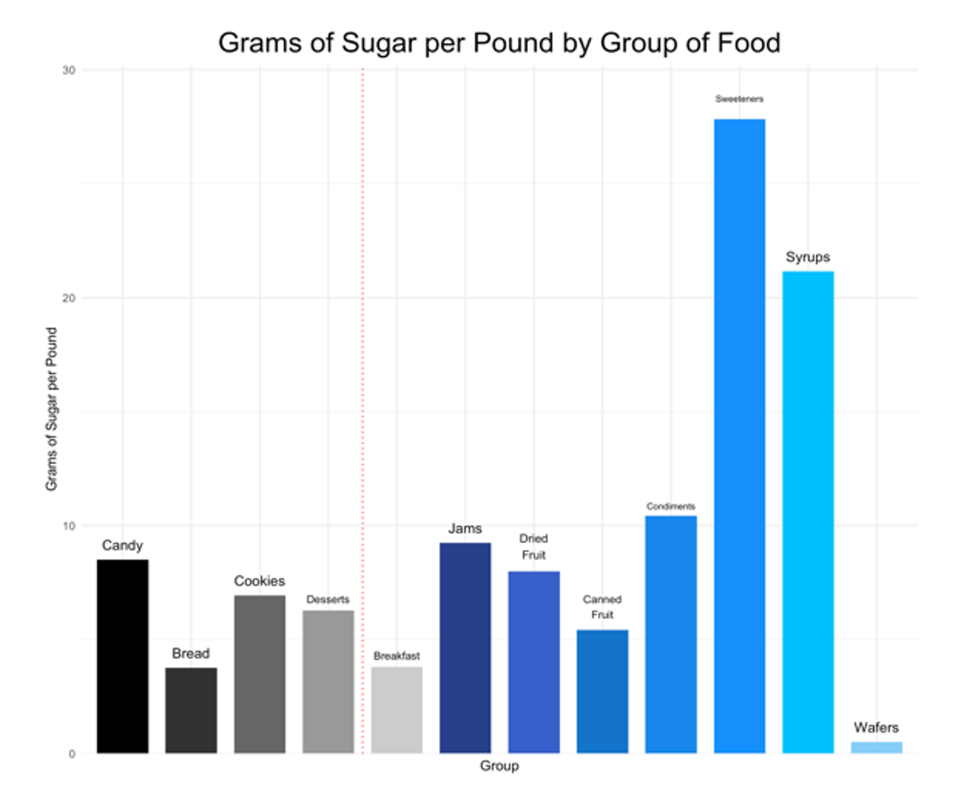 We use data from Nielsen1 which provides weekly point-of-sale data from select stores on all items sold that week in the store. According to the American Economic Association, the Nielsen data has ‘more than half the total sales volume of US grocery and drug stores and more than 30 percent of all US mass merchandiser sales volume.’ We then implemented a web scraping to determine nutrition facts of those Universal Product Codes (UPCs). Our final dataset had 11,181 unique items and 563.8 million reports. These data can help shed light on this topic because it shows what items people are buying and because it is one of the largest datasets available. We study 9 specific types of food which are important contributors to negative health outcomes in the US according to the American Heart Association (AHA). Figure 1 shows the number of transactions, the amount of sugar, and the concentration of sugar for each group.