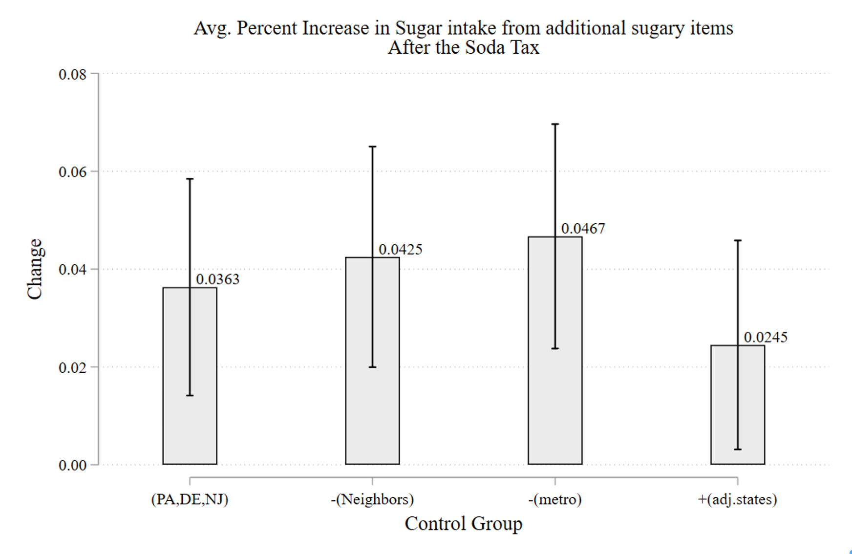 We studied the public’s response to Philadelphia’s soda tax, on one of those avenues of substitution. Namely, we consider whether people began eating more sugary foods in response to the tax since foods were not included in the SSB tax. We find evidence of increased sugary food consumption as a response to the tax.