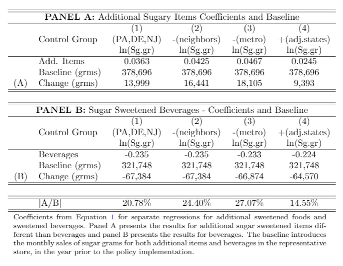 We studied the public’s response to Philadelphia’s soda tax, on one of those avenues of substitution. Namely, we consider whether people began eating more sugary foods in response to the tax since foods were not included in the SSB tax. We find evidence of increased sugary food consumption as a response to the tax.