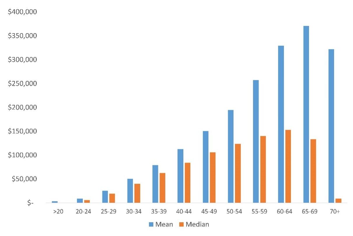 The mean balance peaks at $370,625 for 64–69-year-olds, whilst the median balance peaks at $152,985 for 60–64-year-olds.