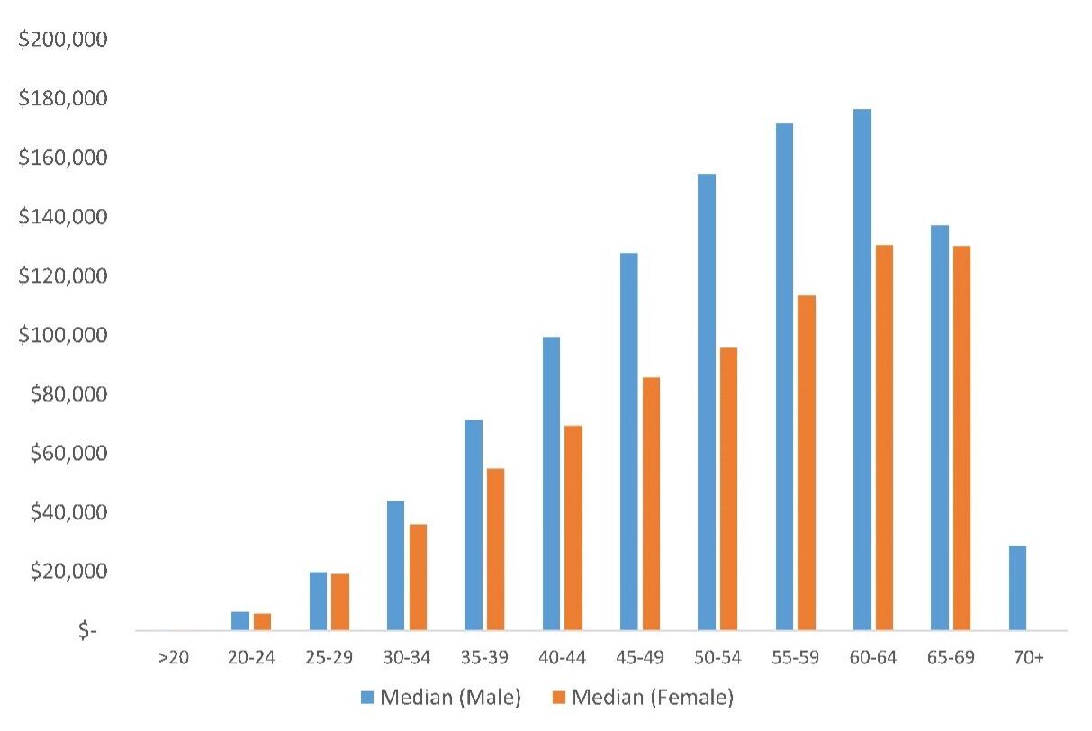 The gender gap is smallest for the 25–29-year-old bracket (4.5%). However, by the 30–34-year-old bracket, it has increased to 22%, with males having a median balance of $43,836 and women $35,930.