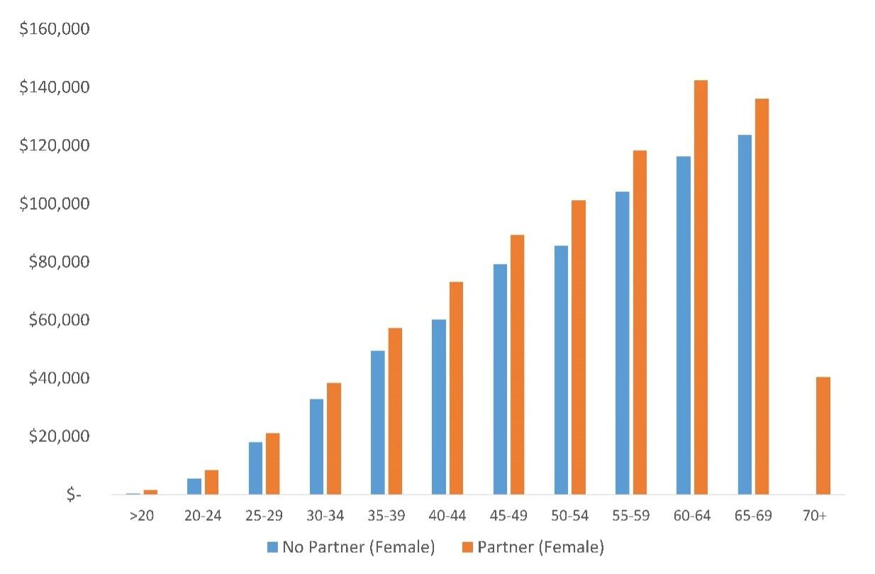 Here, we focus on women. Figure 3 presents the breakdown of median super balances of females by partner status.