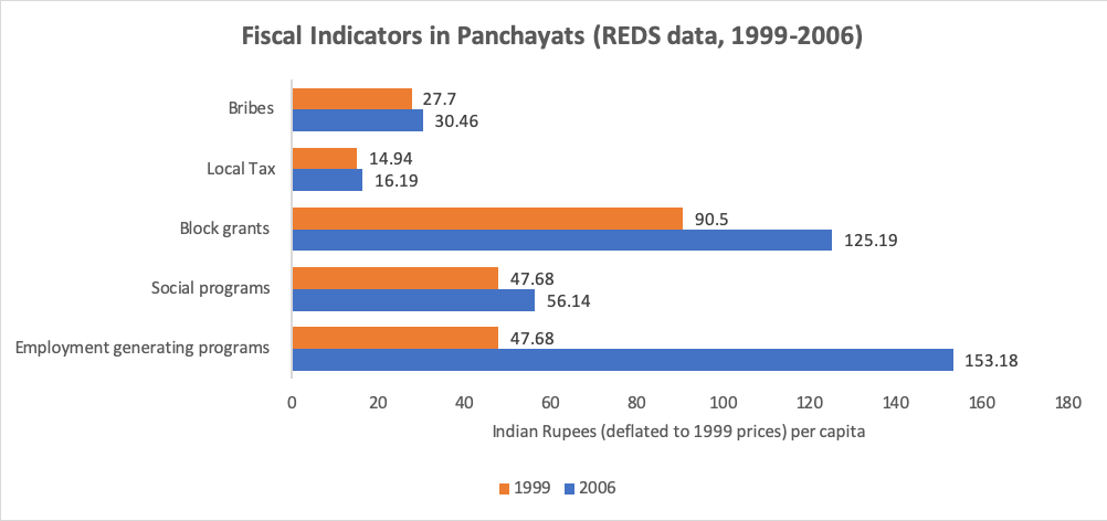 The Rural Economic and Demographic Survey (REDS), collected in 1999 and 2006 by the National Council for Applied Economic Research (NCAER), New Delhi is illuminating in this regard. We use village-level panel data on revenues raised, tied and untied grants received, and other characteristics such as presence of functionaries, village wages, and agricultural incomes.