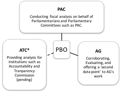 Figure 1 – A Simplified Relationship between the Parliamentary Budget Office (PBO) and the major accountability institutions: Public Accounts Committee (PAC), The Auditor General (AG) and other institutions such as the Accountability and Transparency Commission (ATC*: constitutionally mandated but yet to be established)