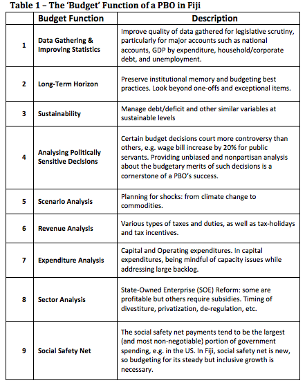 Our work has found that a PBO in Fiji can act as a “coordinator” of budget oversight activities by providing the Public Accounts Committee, the Auditor General, and the Accountability and Transparency Commission, with impartial and non-partisan budget analysis pertaining to fiscal oversight.
