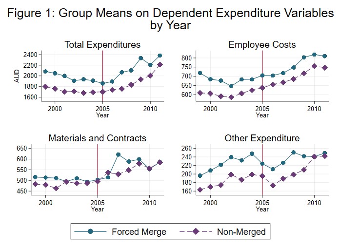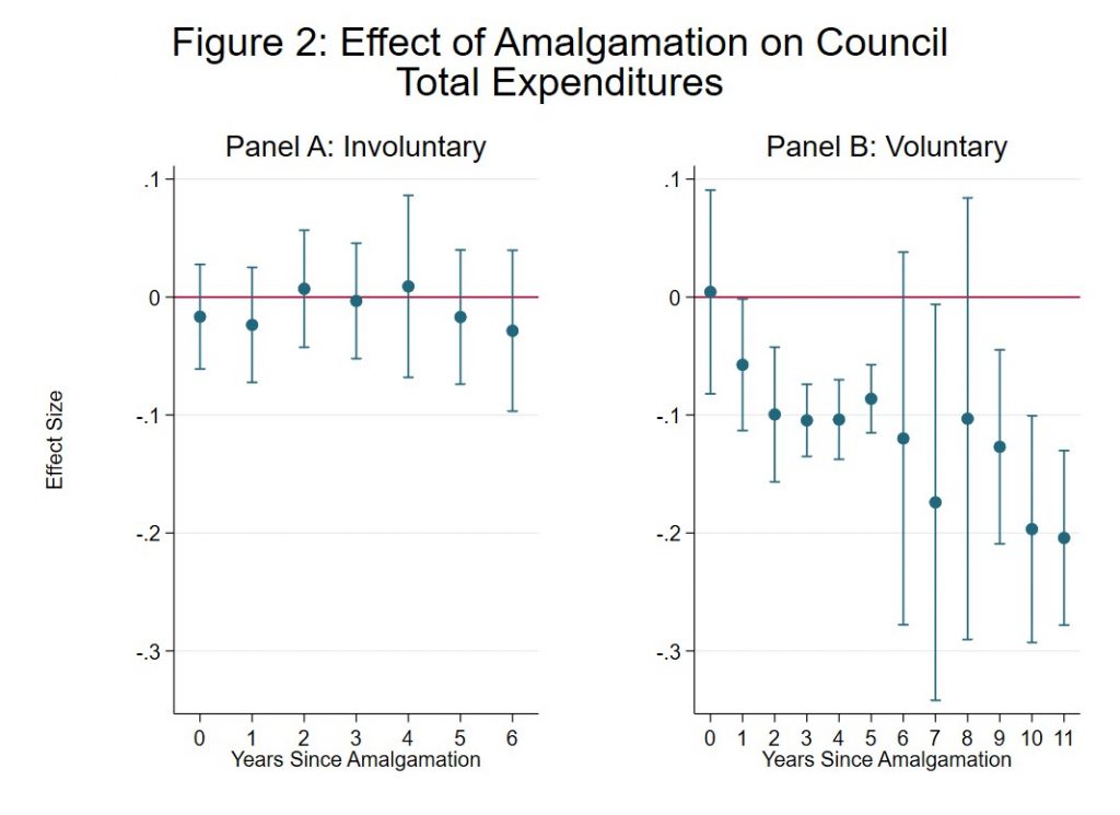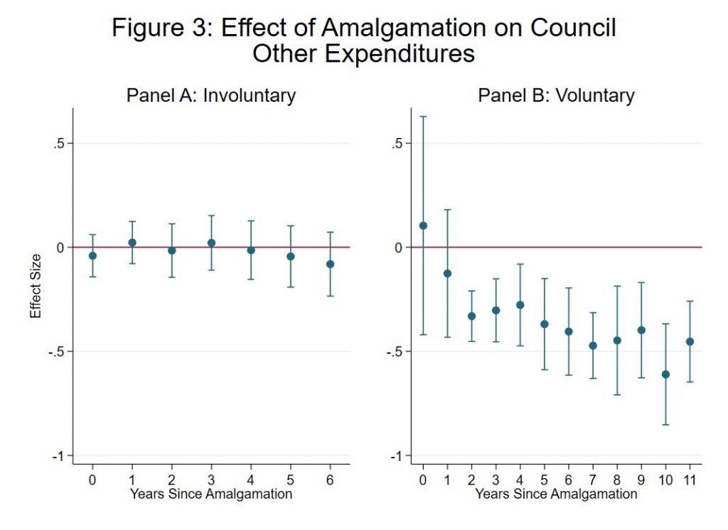 Results for forced amalgamation are depicted in Panel A of Figures 2 and 3, and show that forced amalgamation did not reduce council expenditures in either spending category.