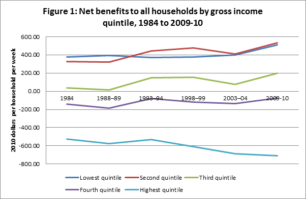 Figure 1 shows the distribution of net benefits over time, expressed in 2010 dollars. Transfers from the highest gross income quintile to the other four quintiles have increased by about 35 per cent. The three lower quintiles have benefited. For the second and third quintiles, the increase has been fairly steady, while for the lowest quintile this increase has taken place only recently. Plainly, there is no blowout in “middle-class welfare”. Overall social welfare transfers to the bottom three quintiles are up by 177 per cent since 1984 and this increase has been made possible by increased rates of contribution from the well-off.