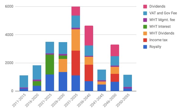 While it seems like an exaggeration (or a misunderstanding) by SOMO to call these issues “abuse,” their report does highlight a question about whether the implications of the treatment of WHT for the overall deal were fully understood. This is perhaps even more important going forward than in assessing the taxes paid so far. Using Open Oil’s base case model the difference between a 20 percent or 6.6 percent  withholding tax on interest could be worth around $1.3 billion over the life of the mine (undiscounted), while the difference between a 20 percent  or a 0 percent  dividend withholding tax (as secured by the Netherlands treaty) is worth around $3.7 billion.