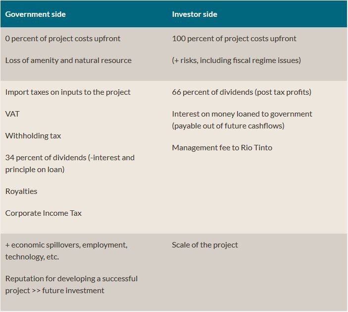 The thing that complicates the fiscal side of the deal is that the government is getting a 34 percent “carried interest.” Turquoise Hill and its shareholders are covering 100 percent of the upfront exploration and development costs but will only end up owning a 66 percent share of the project, while the government will not put up any of the up-front investment but will end up with a 34 percent share (through the state-owned enterprise Erdenes).