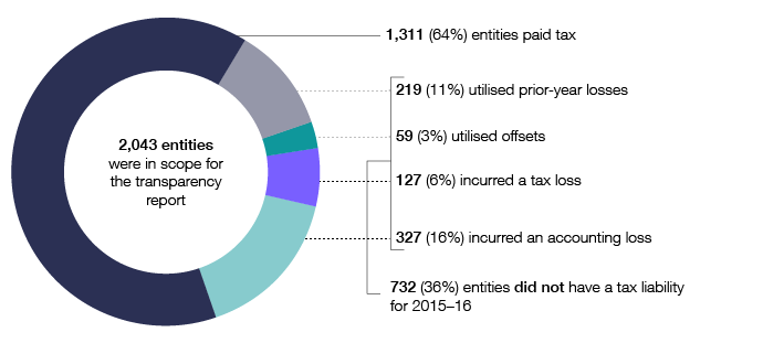 - There are 2,043 corporate entities in the 2015–16 corporate transparency population, with total income tax payable of $38.2 billion. This represents almost 60 per cent of total company tax payable.