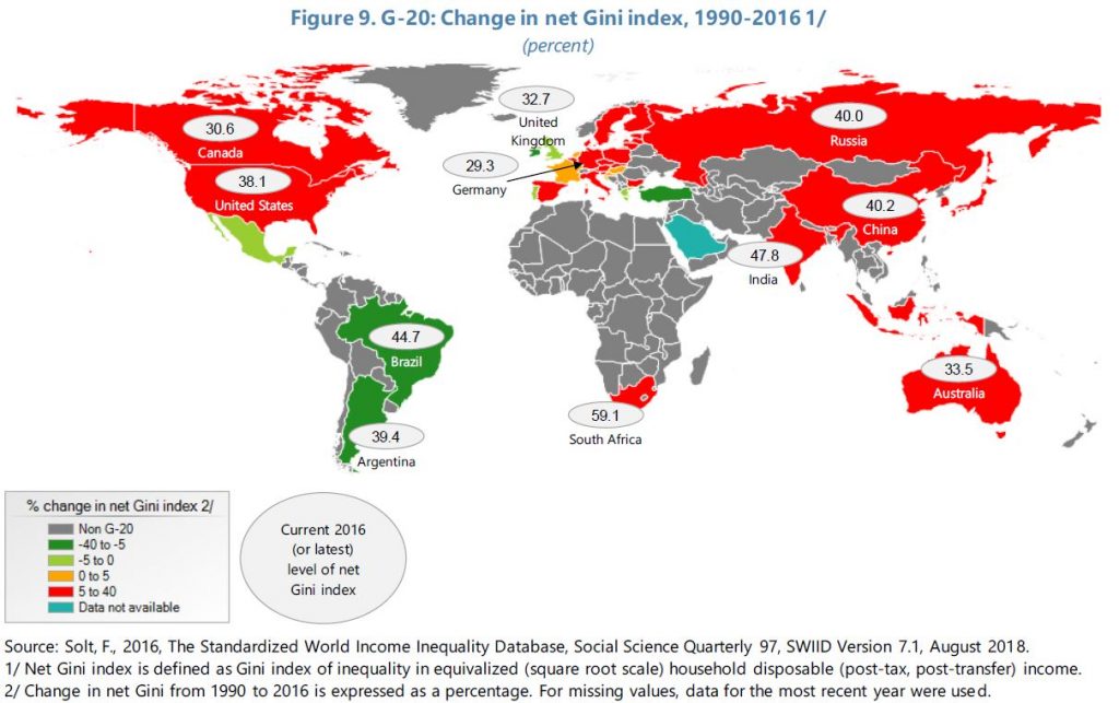 The report finds that inequality has risen since 1990 in almost all G20 advanced economies, such as Australia, and in many emerging economies. Across the G20, earners in the bottom 10 percent of the income distribution, on average, earn only 8 percent of what earners in the top 10 percent make. These persistent inequalities reflect and reinforce uneven access to economic opportunities, such as education, health care, and financial services.