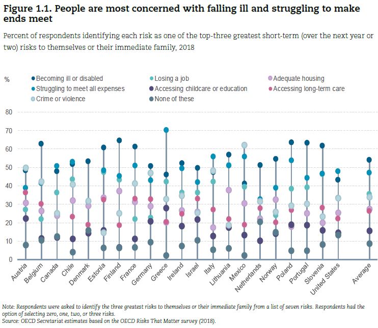 The Risks that Matter Survey by the Organisation for Economic Co-operation and Development polled a representative sample of 22,000 adults in 21 OECD countries in 2018. Now released, the study examines people’s perceptions of the social and economic risks they face and assesses how well people feel government reacts to their concerns. Although the survey does not include Australia, it covers a variety of countries: Austria, Belgium, Canada, Chile, Denmark, Estonia, Finland, France, Germany, Greece, Israel, Ireland, Italy, Lithuania, Mexico, the Netherlands, Norway, Poland, Portugal, Slovenia and the United States.
