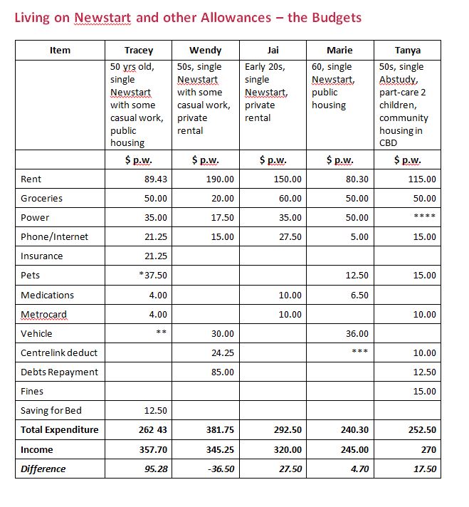 The SACOSS report, which includes examples of household budgets of five people trying to live on Newstart, finds that: