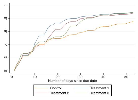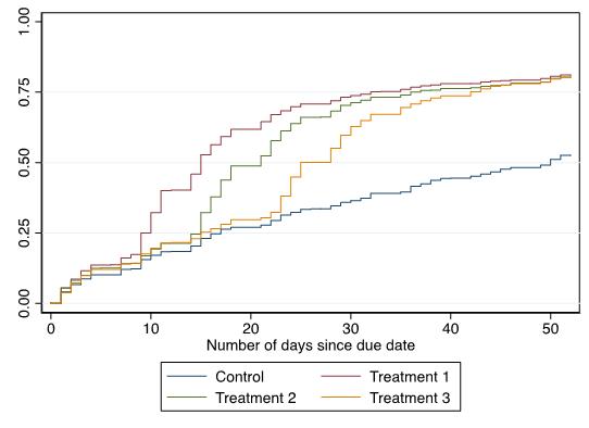 In sum, we find that the probability of payment at the end of the seven-week field experiment was 25 percentage points greater for each group that received a reminder letter relative to the control group. However, there was no difference in the probability of payment between treatment groups at the end of the seven-week trial period, regardless of whether the reminder letter was sent one, two or three weeks after the due date.