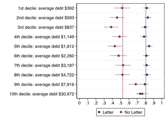To determine the “tipping point” beyond which the reminder letters are no longer effective, we examine the effect of receiving a letter (i.e. the effect of being in one of the three treatment groups) on debt payments by the initial debt level of the taxpayer. Figure 3 shows the difference between businesses that do and do not receive a reminder letter within each decile of the initial debt level.