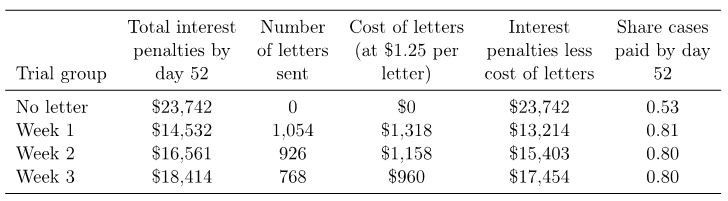 It is interesting to compare the revenue implications of varying the letter send date. For each day a tax debt is outstanding the ATO levies interest penalties at the rate of 8 percent per annum, compounded daily. Thus, delaying the date at which a debt is paid raises more revenue from penalties. Delaying the reminder letter send date also reduces cost, because some debts will be paid in the intervening period and fewer letters need to be sent. However, compared with interest penalties the cost of sending the reminder letters is low, at about AUS$1.25 per letter, including postage. Table 1 summarizes these costs and benefits for each group.