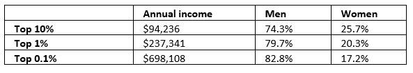 Distributional analysis of the tax cuts by the Parliamentary Budget Office (PBO) demonstrates that overall, the tax cuts will benefit men significantly more than women, in each Stage, over 4 years and over 10 years.[4] This is unsurprising. ATO individual tax records data reveals very significant gender inequality in income, especially at the top of the income distribution (Table 3).