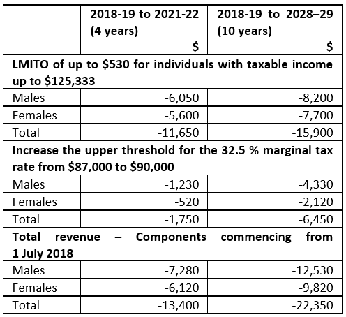 The fiscal cost by gender of Stage 1 of the tax cuts is estimated by the PBO over 4 years at $7.28 billion for men and $6.12 billion for women. The PBO estimates that 5,146,000 men and 4,863,000 women will benefit from LMITO in the 2018-19 year.[7] This suggests that men and women benefit close to equally from the LMITO overall both in raw numbers and in dollars.